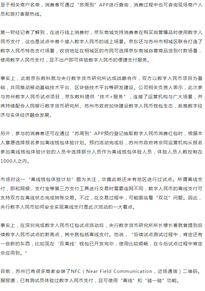蘇州數(shù)字人民幣消費(fèi)紅包活動(dòng)的開展,也反映了我國數(shù)字人民幣的試點(diǎn)工作正穩(wěn)步推進(jìn)。而和此前深圳開展紅包試點(diǎn)不同的是,本次蘇州數(shù)字人民幣紅包活動(dòng)還支持消費(fèi)者通過京東商城進(jìn)行線上消費(fèi)。