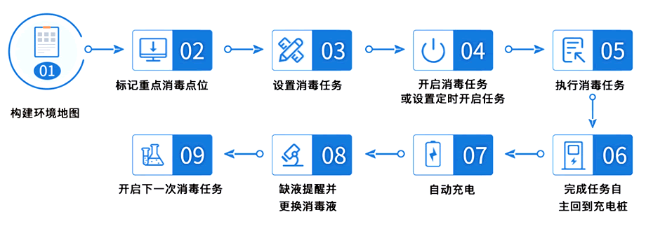 機(jī)器人消毒相比人工具有無(wú)需人工值守、360°消毒不留死角、自動(dòng)生成消殺日志等優(yōu)勢(shì)。消殺結(jié)束后自主回樁充電,實(shí)現(xiàn)消毒工作全程智能操作,人機(jī)分離,減少接觸,更無(wú)需擔(dān)心交叉感染,為疫情防控增添了一道科技風(fēng)景線。