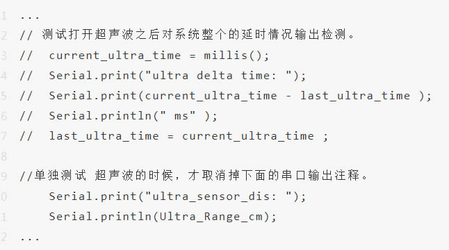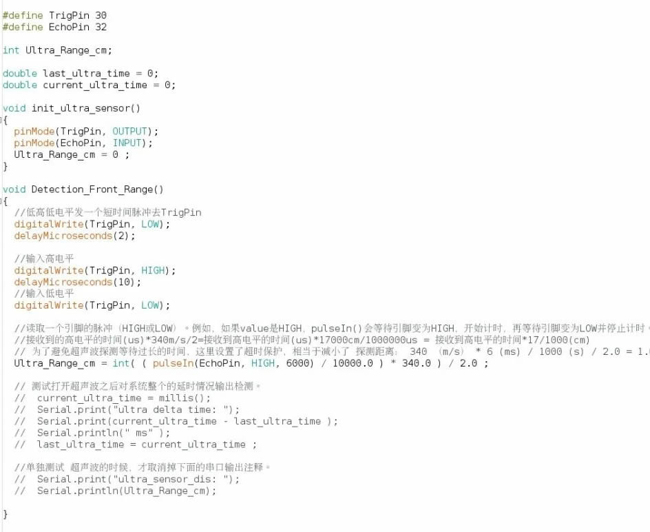 該程序定義了一個(gè)存儲(chǔ)測距信息的變量 Ultra_Range_cm , 測距范圍為“0-1m”。此時(shí),我們可以看見下面有兩大段注釋。其中,D一段是用來測試整個(gè)系統(tǒng)功能執(zhí)行一遍所需要的時(shí)間,若取消掉注釋,即可在 串口監(jiān)視器 實(shí)時(shí)查看輸出的時(shí)間信息。
