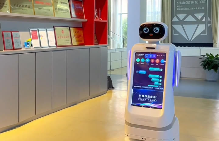 前臺(tái)接待機(jī)器人為多種類型的單位(如餐廳,商場,展廳,接待室,機(jī)場,車站,圖書館,學(xué)校等)完成前臺(tái)接待工作,按照設(shè)置好的路線提供講解服務(wù),隨時(shí)解答訪客提出的相關(guān)問題