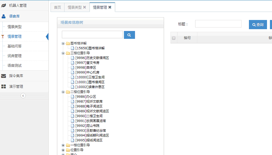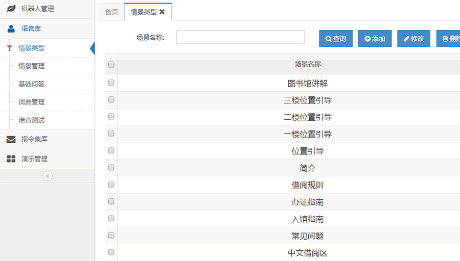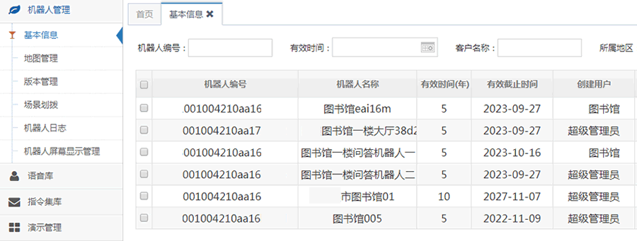 迎賓機(jī)器人管理的功能是對用戶使用的機(jī)器人信息進(jìn)行管理,包括機(jī)器人基本屬性的配置,以及相關(guān)信息的常規(guī)操作,增刪改查等功能。