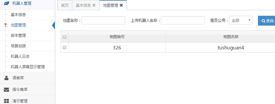 地圖管理模塊是對機(jī)器人地圖庫及對應(yīng)地圖和記錄點(diǎn)的查看,包括地圖名稱,對應(yīng)的機(jī)器人名稱和更新時間等內(nèi)容。