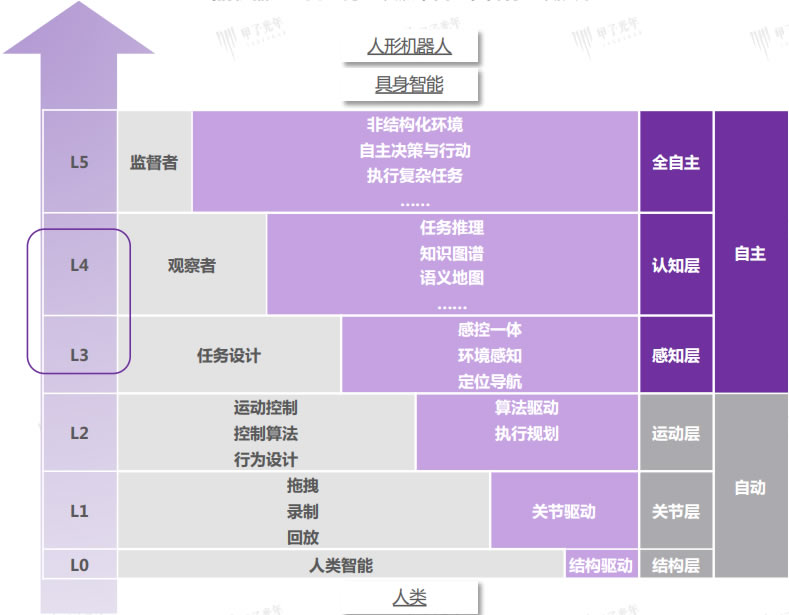第三代為智能機(jī)器人(L4-L5):擁有更豐富的傳感器和更G的智能水平,不僅能獲取并處理外部綜合信息,甚至能據(jù)此自己制定行動目標(biāo),其智能主要體現(xiàn)在感知交互、獨(dú)立決策、自我優(yōu)化三個(gè)方面。